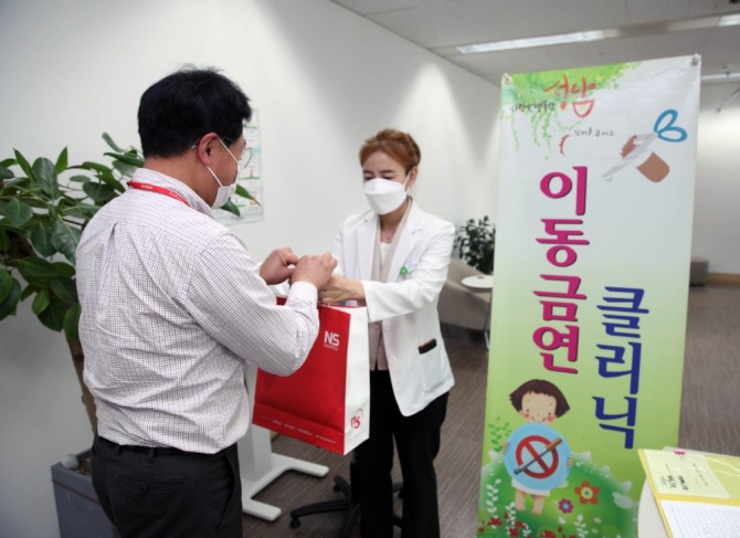 금연에 성공한 NS홈쇼핑 임직원에 성남시 분당구 보건소에서 금연성공선물을 전달하고 있다. 사진=NS홈쇼핑이미지 확대보기