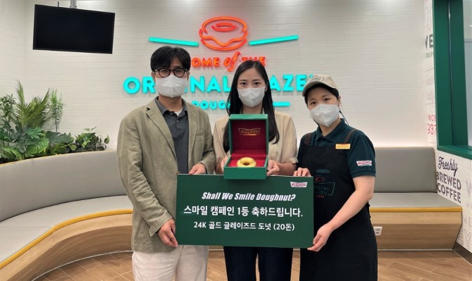 스마일 캠페인은 고객들의 많은 참여로 성황리에 마쳤으며, 1등 당첨자로 선정된 고객에게는 크리스피크림도넛 롯데백화점 미아점에서 오리지널 글레이즈드 실물과 동일한 사이즈의 24K 골드 글레이즈드 도넛(순금20돈) 전달 및 총 1937명에게 추첨 경품 증정을 완료했다.