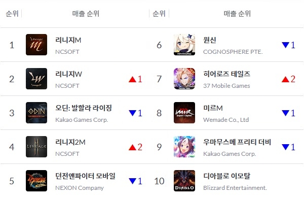 이미지 확대보기IGA웍스 앱 통계 분석 플랫폼 모바일인덱스에 따르면 22일 구글 플레이스토어 매출 톱10 게임은 일주일 전인 15일에 비해 그대로 유지됐다. '리니지W' 외에도 NC '리니지2M', 37게임즈 '히어로즈 테일즈' 등 이 소폭 순위를 끌어올렸다.