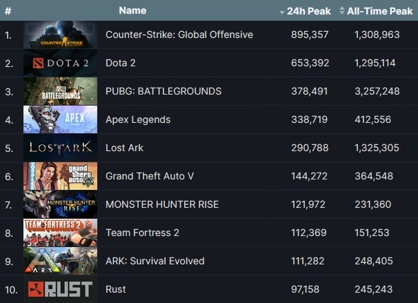 국산 게임 중 3위 크래프톤 '펍지: 배틀그라운드'와 로스트아크 외에도 위메이드 '미르4'가 4만3098명으로 30위, 펄어비스 '검은 사막'이 1만8733명으로 77위, 님블뉴런 '이터널 리턴'이 9063명으로 121위를 기록했다.