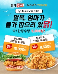 방송은 11일 오후 3시 5분 KT알파 쇼핑 라이브커머스 '알파 LIVE(라이브)'와 '네이버 쇼핑라이브'에서 동시 진행한다. 방송에서는 맘스터치 1만원 금액원을 15%, 2만원 금액권을 25% 할인된 가격에 한정 판매한다. 맘스터치 금액권은 전 메뉴 구매 시 사용할 수 있다.