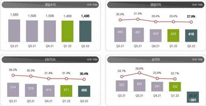 이미지 확대보기이번 실적은 전년 동기 대비 매출 5.6%, 영업이익 14.8%가 감소 직전분기와 비교하면 매출 0.2%, 영업이익 2.1%가 감소한 수치이며 당기순적자로 전환했다.