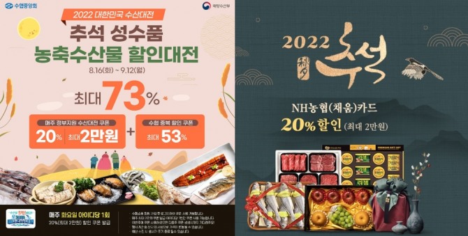 수협쇼핑의 경우, 금일부터 4주간 수산물을 구매하는 모든 고객에게 매주 1인당 20%(최대 2만원) 할인쿠폰을 지원하는 대한민국 수산대전(추석 성수품 녹축수산물 할인대전)을 실시한다. 행사기간 동안 매주 수산물을 구매할 경우, 최대 8만원의 할인쿠폰을 지원 받을 수 있다.