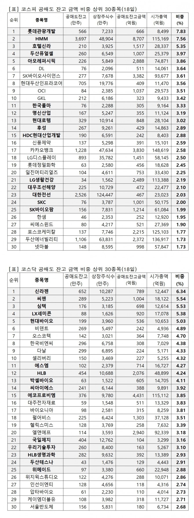 이미지 확대보기23일 한국거래소에 따르면 지난 18일 기준 유가증권시장과 코스닥시장에서 시가총액 대비 공매도 잔고금액 비중 상위 종목은 다음과 같다.