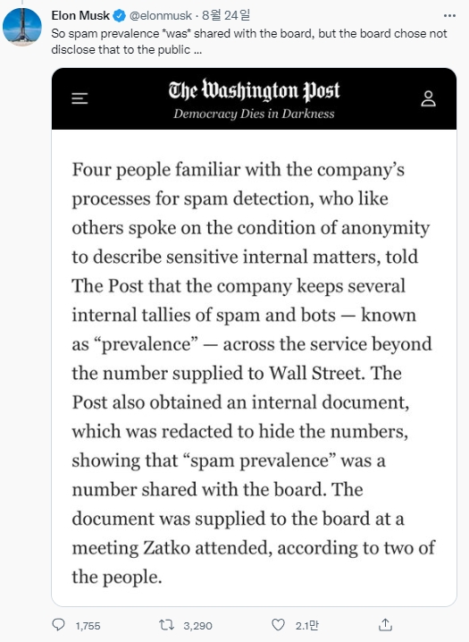 머스크 CEO는 24일(이하 현지시간) 트위터에 워싱턴포스트(WP)의 단독기사를 공유하며 올린 글에서 “가짜계정이 만연해 있음을 트위터 경영진도 알고 있다는 것이 드러난 것”이라면서 “트위터 경영진은 사실을 알면서도 대중을 속이는 선택을 했다”고 밝혔다.