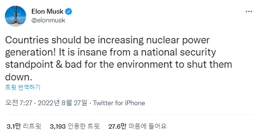 머스크는 특히 당시 올린 트윗에서 러시아의 우크라이나 침공으로 유럽에 에너지 위기가 닥쳤음에도 원전 축소 정책을 바꾸지 않고 있는 독일 정부의 행보를 정면으로 비난했다.
