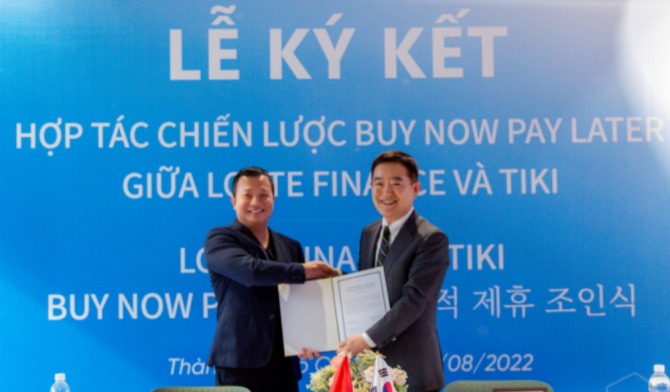 이미지 확대보기지난 24일 김종극 롯데파이낸스 베트남 법인장, 쩐 응옥 타이 썬 티키 대표이사 등이 참석한 가운데 호치민시 전자상거래 플랫폼에서 전략적 제휴 체결식이 열렸다. 체결식에서 BNPL 서비스에 관한 업무 협력을 체결한 양사는 BNPL 서비스를 9월부터 실시할 것으로 합의했다.