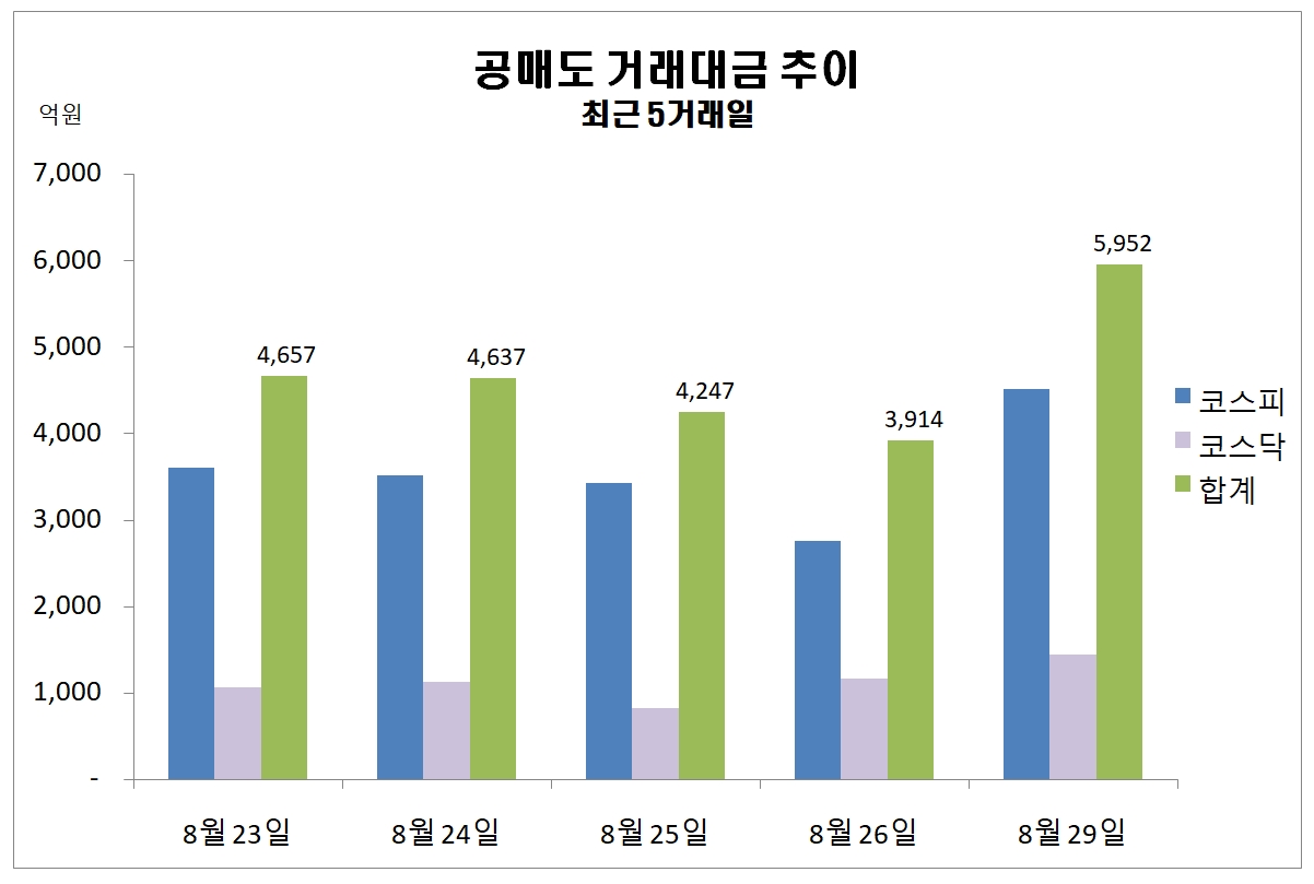 공매도 거래대금 급증 6000억 육박…전거래일 보다 2038억 증가