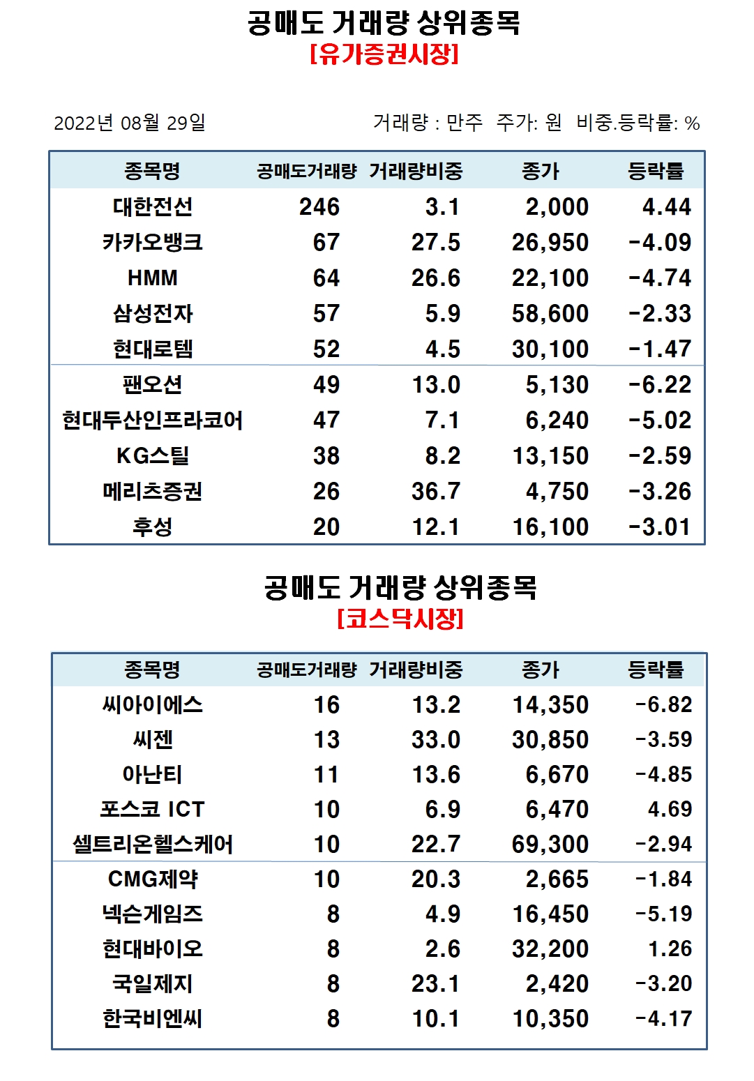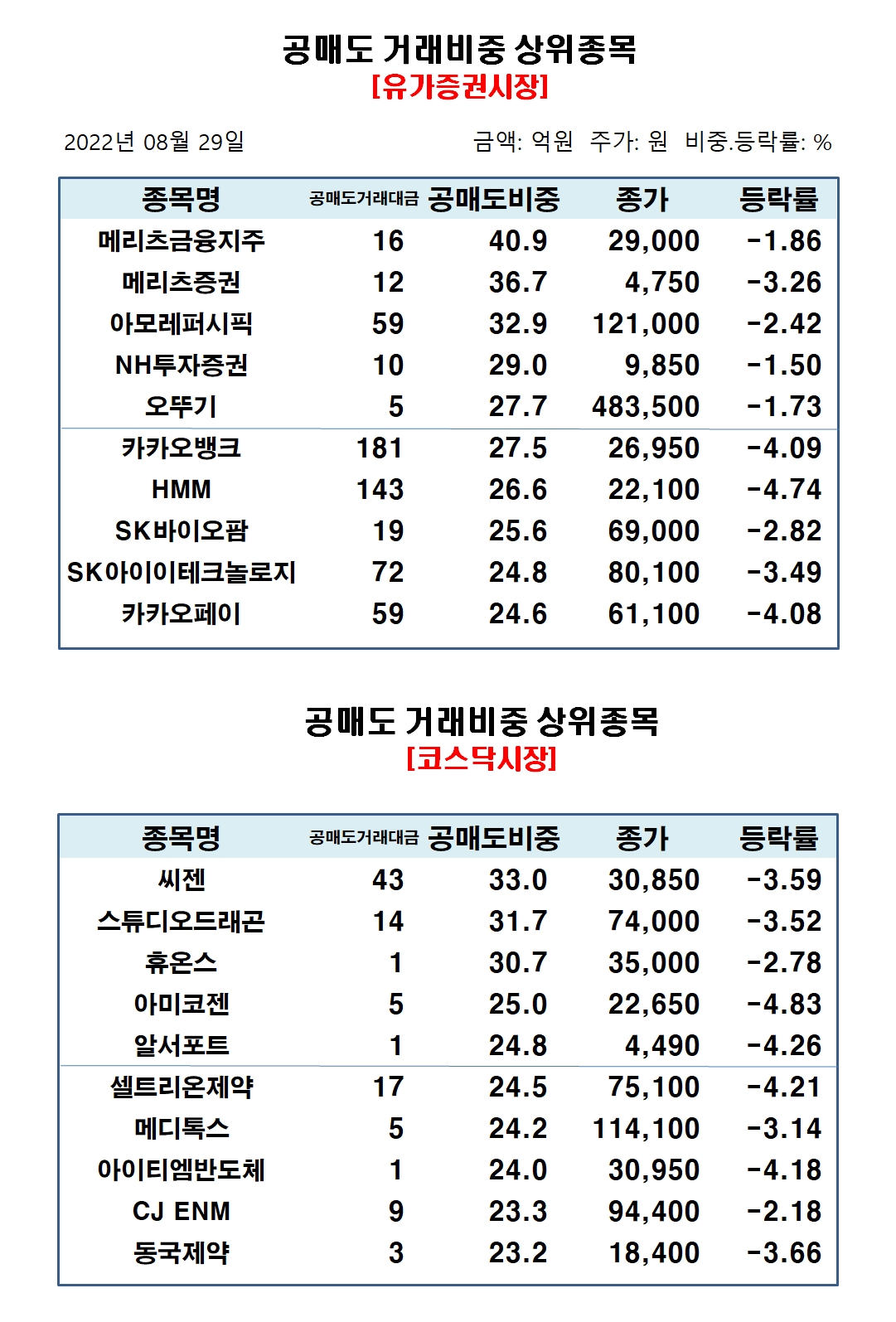유가증권시장에서 공매도 거래비중 상위종목은 메리츠금융지주 40.87%, 메리츠증권 36.65%, 아모레퍼시픽 32.87%, NH투자증권 29.04%, 오뚜기 27.71%, 카카오뱅크 27.52%, HMM 26.56%, SK바이오팜 25.55%, SK아이이테크놀로지 24.78%, 카카오페이 24.6% 순으로 집계됐다.