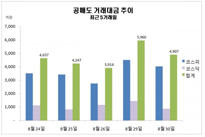 31일 한국거래소에 따르면 지난 30일 주식시장에서 공매도 거래대금 규모는 4906억원을 기록했다.