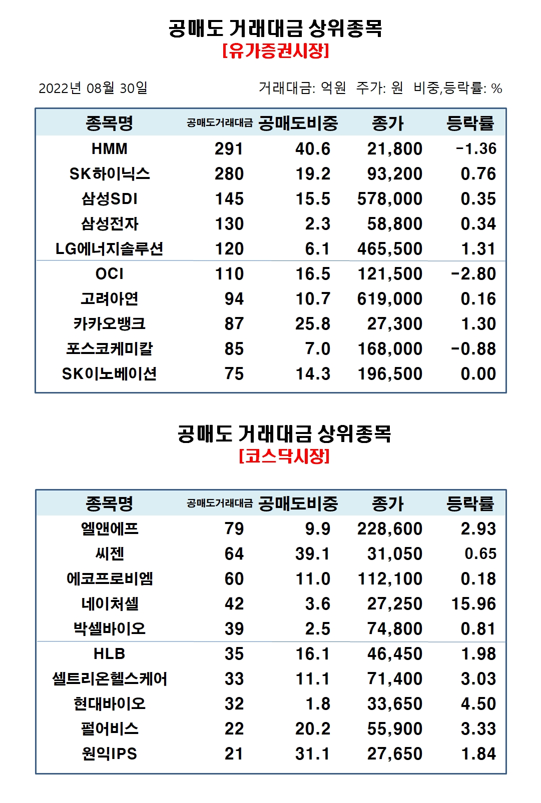 유가증권시장에서 공매도 거래대금 상위종목은 HMM 291억원, SK하이닉스 280억원, 삼성SDI 145억원, 삼성전자 130억원, LG에너지솔루션 120억원, OCI 110억원, 고려아연 94억원, 카카오뱅크 87억원, 포스코케미칼 85억원, SK이노베이션 75억원 순으로 집계됐다.