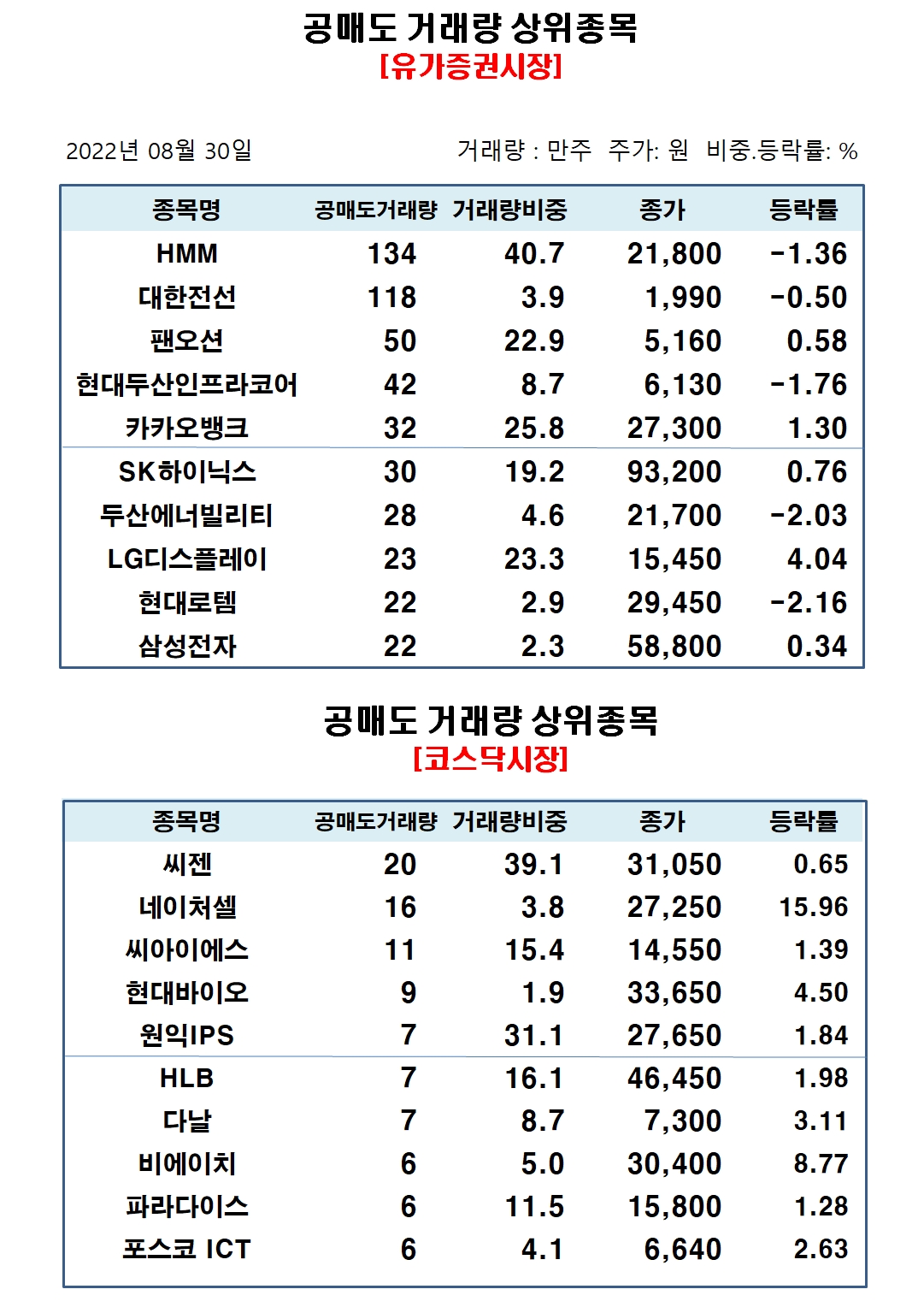 유가증권시장에서 공매도 거래량 상위종목은 HMM 134만주, 대한전선 118만주, 팬오션 50만주, 현대두산인프라코어 42만주, 카카오뱅크 32만주, SK하이닉스 30만주, 두산에너빌리티 28만주, LG디스플레이 23만주, 현대로템 22만주, 삼성전자 22만주 순으로 집계됐다.