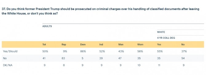 민주당 성향 응답자들은 86%가 트럼프를 기소해야 한다고 밝힌 반면, 공화당 지지 응답자들은 9%만 이에 동의한다고 밝혔다.