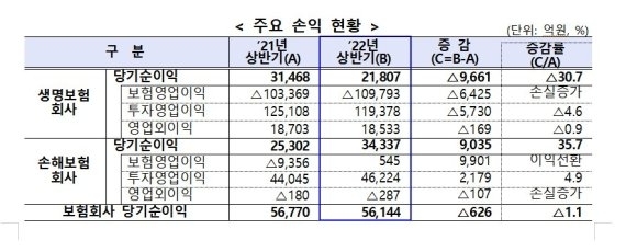 이미지 확대보기6일 금융감독원에 따르면 올해 상반기 생보사 23곳, 손보사 29곳 등 보험사들의 당기순이익은 5조6144억원으로 전년 동기 대비 626억원(1.1%) 줄었다.