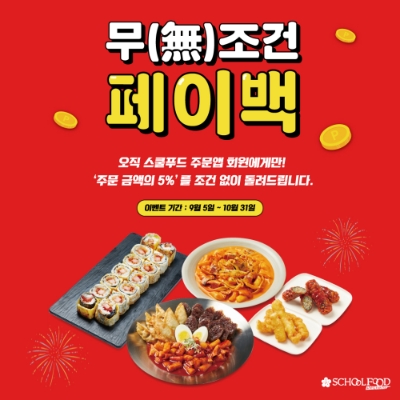 10일 외식프랜차이즈업계에 따르면 스쿨푸드는 배달 횟수와 결제 금액 제한없이 무제한 페이백을 해주는 '스쿨푸드 무(無)조건 페이백!'을 이벤트를 10월 31일까지 진행한다.