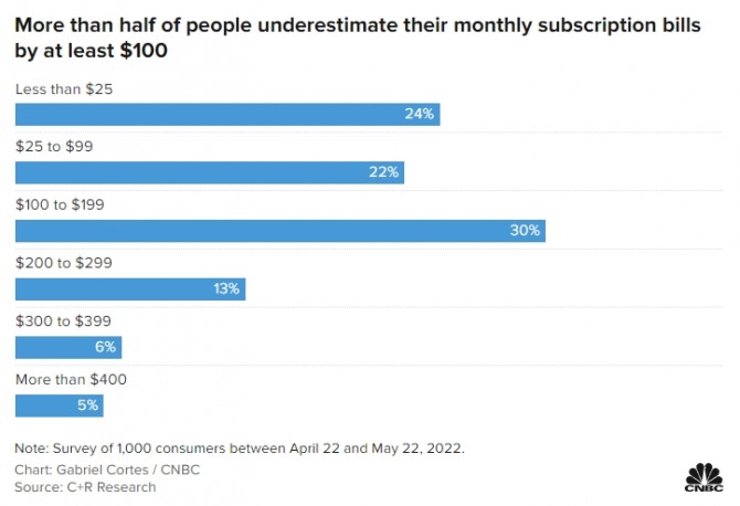 구독 서비스를 이용하는 댓가로 당초 예상한 월지출 규모는 86달러(약 11만9000원)였는데 실제로 쓴 돈은 219달러(약 30만4000원)였다는 것. 구독 서비스 때문에 당초 예상한 것보다 2.5배 정도 매달 쓰는 돈이 늘었다는 뜻이다.
