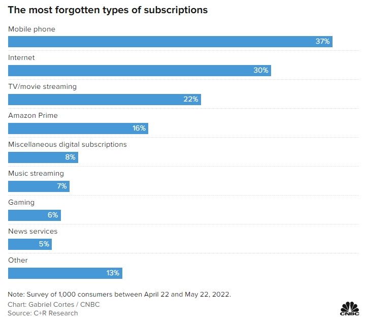 응답자들이 요금이 빠져나가는 것을 깜빡 잊고 있었던 구독 서비스를 유형별로 살펴보면 휴대폰 요금이 37%로 으뜸을 차지했고 인터넷 관련 요금이 30%로 2위, TV나 영화 스트리밍 서비스 요금이 22%로 3위를 기록했다.