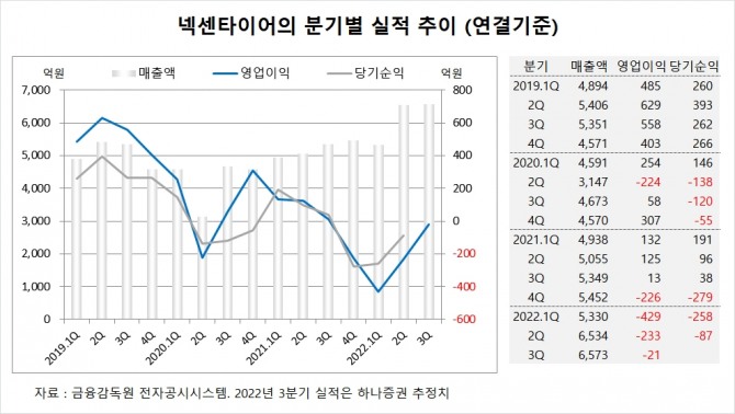 하나증권은 넥센타이어의 올해 3분기 연결기준 매출액이 6573억원, 영업이익이 –21억원에 이를 것으로 내다보고 있습니다.