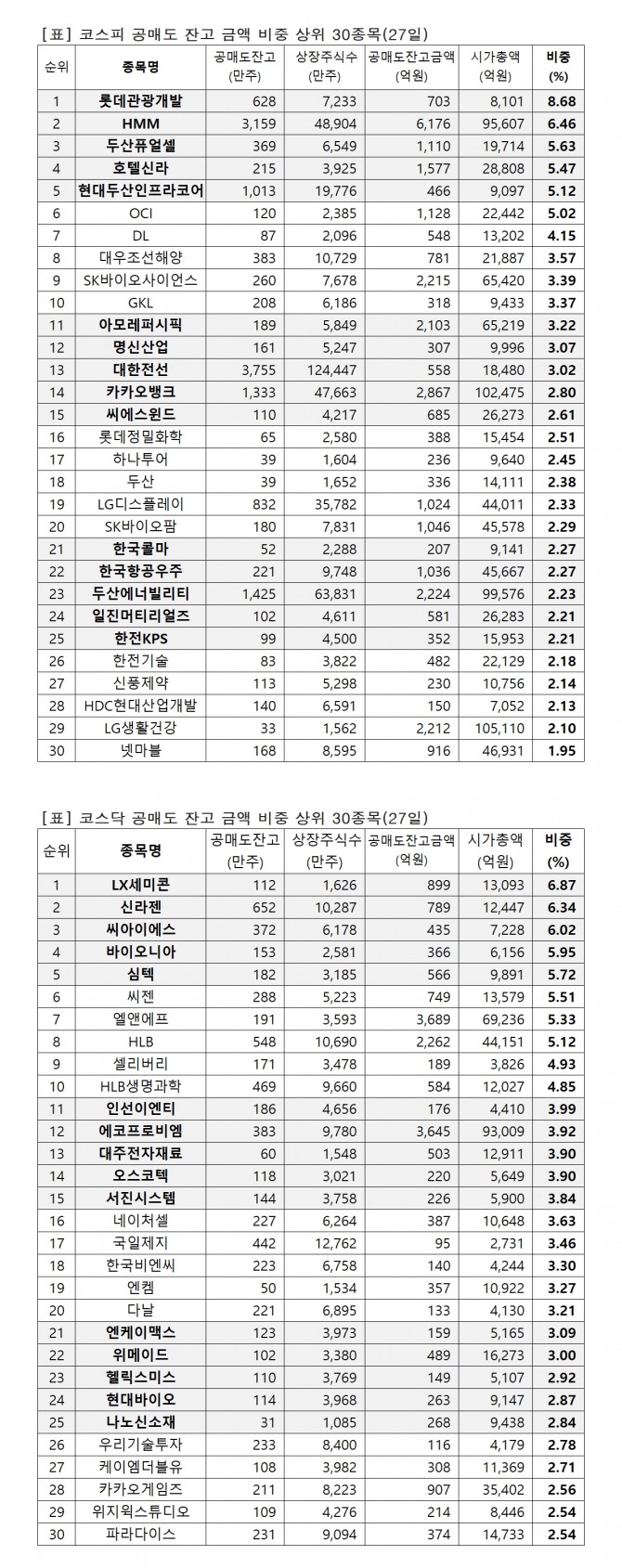 이미지 확대보기유가증권시장 시가총액 대비 공매도 잔고금액 비중(27일)