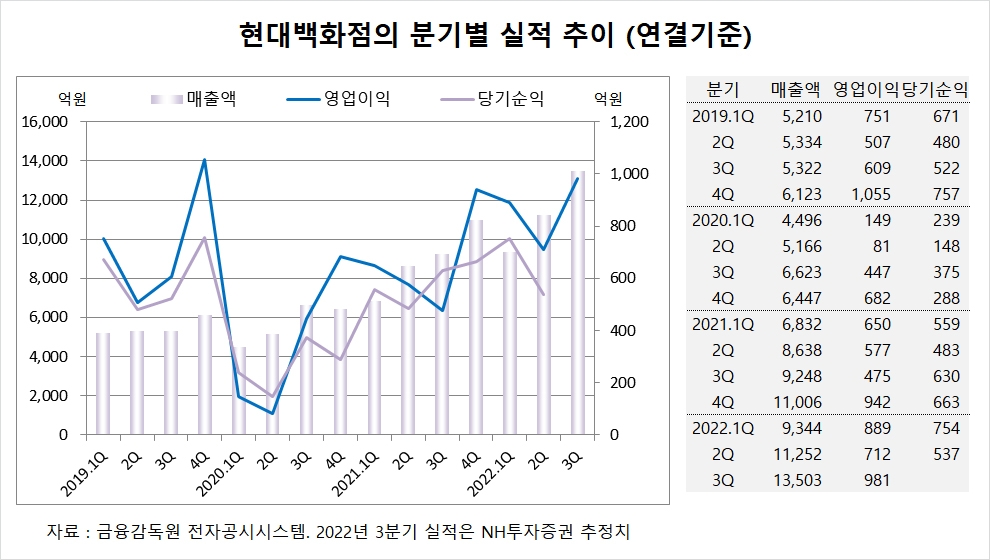 NH투자증권은 현대백화점의 올해 3분기 연결기준 매출액이 1조3503억원, 영업이익이 981억원에 이를 것으로 내다보고 있습니다. 현대백화점의 3분기 영업이익 시장 컨센서스는 760억원입니다. 현대백화점의 영업이익이 시장 컨센서스보다 많은 것은 3분기부터 지누스 손익이 연결 실적에 반영되기 때문입니다.