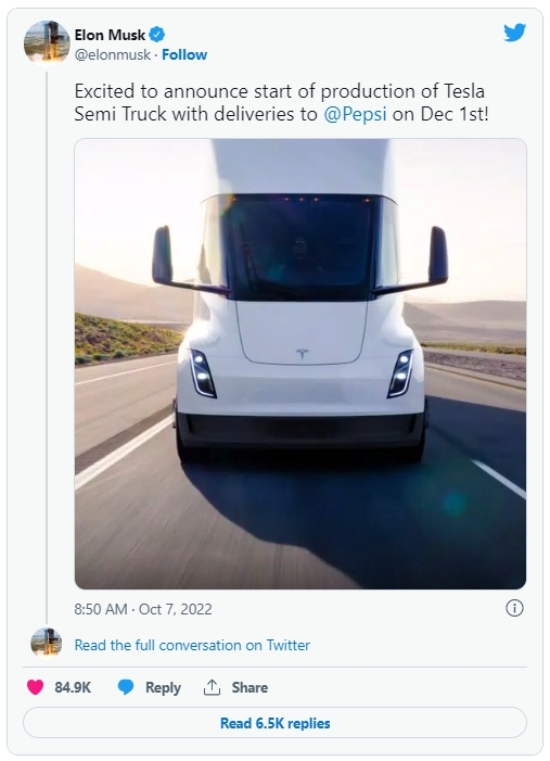 이미지 확대보기머스크는 6일(현지 시간) 트위터를 통해 세미가 생산에 들어갔으며 오는 12월 1일 펩시코가 첫 배송을 받게 될 것이라고 알렸다.