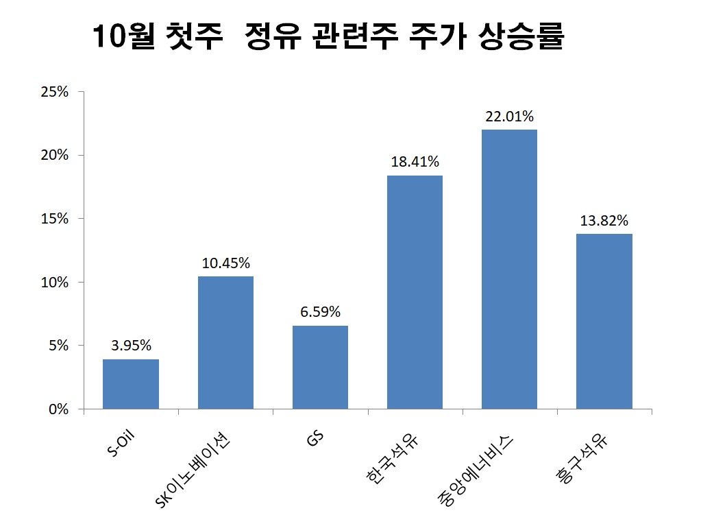 11일 한국거래소에 따르면 10월 첫 주 동안 S-Oil은 주가가 3.95% 상승했고, SK이노베이션은 10.45% 상승했다. GS칼텍스 지주사인 GS는 6.59% 상승했다. 특히 석유 유통 기업들의 주가 상승세가 두드러졌다. 같은 기간 중앙에너비스는 22.01% 올라 상승률이 가장 높았으며, 한국석유 (18.41%), 흥구석유(13.82%) 도 각각 상승했다.