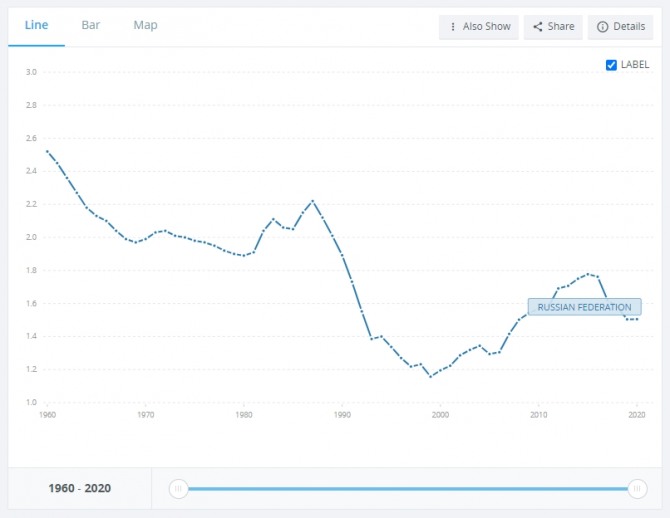러시아의 출산율 추이. 러시아의 전신인 소련 체제가 지난 1991년 붕괴된 것을 계기로 출산율이 급락한 뒤 회복되지 못하고 있다. 사진=세계은행