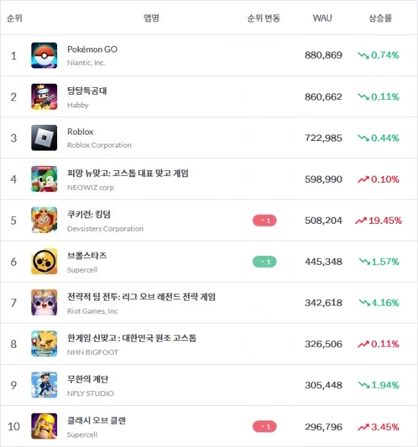 '쿠키런: 킹덤' 외 다른 상위권 게임들의 WAU는 소폭 변화한 가운데나이언틱 '포켓몬 고'와 하비 '탕탕특공대'가 WAU 2만명 이하의 격차를 보이며 1, 2위를 다투고 있다.