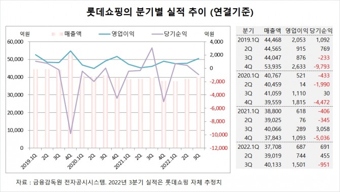 롯데쇼핑은 올해 3분기 실적을 잠정 집계한 결과 연결기준 매출액이 4조133억원, 영업이익이 1501억원, 당기순이익이 –951억원에 이를 것이라고 공시했습니다.