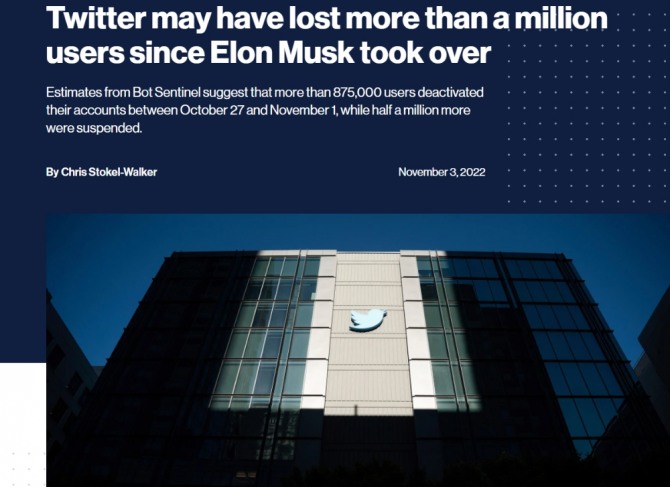 미국 일간 USA투데이는 MIT 테크놀로지 리뷰의 최근 기사를 인용해 머스크가 트위터를 인수한 뒤 사용자 현황을 계정을 기준으로 조사한 결과 87만5000명에 달하는 트위터 사용자가 자신의 계정을 없앤 것으로 파악됐다고 8일 보도했다.