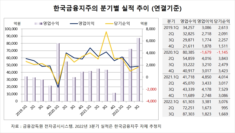 한국금융지주는 올해 3분기 실적을 잠정 집계한 결과 연결기준 영업수익(매출액)이 8조7303억원, 영업이익이 1823억원, 당기순이익이 1669억원에 이를 것이라고 공시했습니다.