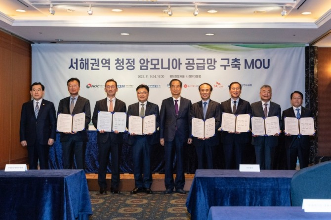 롯데그룹 내에서 화학 사업을 담당하는 롯데케미칼과 롯데정밀화학은 지난 9일 서울 소공동 롯데호텔서울에서 한국석유공사, 남동발전, 서부발전, 포스코, SK가스, 삼성엔지니어링과 서해 권역 청정 암모니아 공급망 구축 사업 추진을 위한 양해각서(MOU)를 체결했다고 10일 밝혔다.