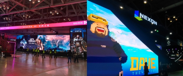 이미지 확대보기제1전시장의 양 끝은 각각 오른쪽에 위메이드, 왼쪽에 넥슨이 한쪽 면 전체를 차지할 정도로 큰 부스를 선보였다. 위메이드는 차기작 '나이트 크로우', '레전드 오브 이미르'와 자사 블록체인 위믹스(WEMIX) 플랫폼에 대해 소개했다.