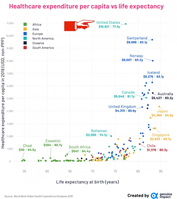 의료비 지출과 기대수명 추이의 상관관계. 미국의 경우 의료비 지출 규모는 세계 1위지만 기대수명은 매우 낮은 것으로 나타났다. 사진=세계은행/비주얼캐피털리스트/글로벌이코노믹