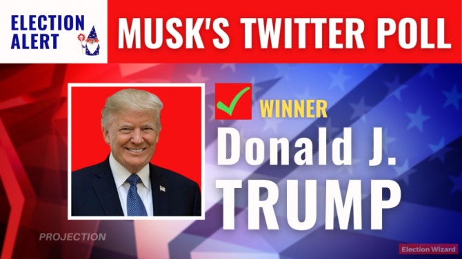 머스크는 사안의 중대성을 감안해 지난 18일(이하 현지시간) 하루동안 자신의 계정에서 트럼프의 복권에 대한 찬반 의견을 묻는 즉석 설문조사를 벌였고 그 결과 찬성 51.8%, 반대 48.2%의 결과가 나온 것을 근거로 트럼프 복권을 결정하는 형식을 취했다.