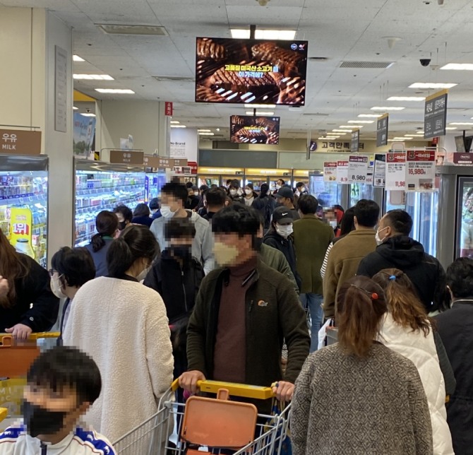 또 다른 회원은 “정육코너, 과일코너까지 줄 서 있꼬 TV 전단행사는 이미 오픈런으로 조기소진됐었다”라며 “매장안은 북적여 카트 움직이기도 어려웠다”고 했다.