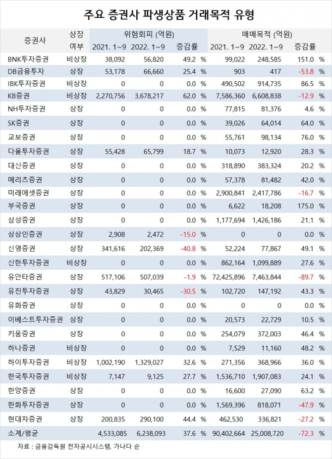 NH투자증권은 9월말 누계 파생상품 매매목적 거래가 8조1376억원, SK증권은 매매목적 거래가 6조4014억원, 교보증권은 매매목적 거래가 9조8134억원을 기록했습니다.