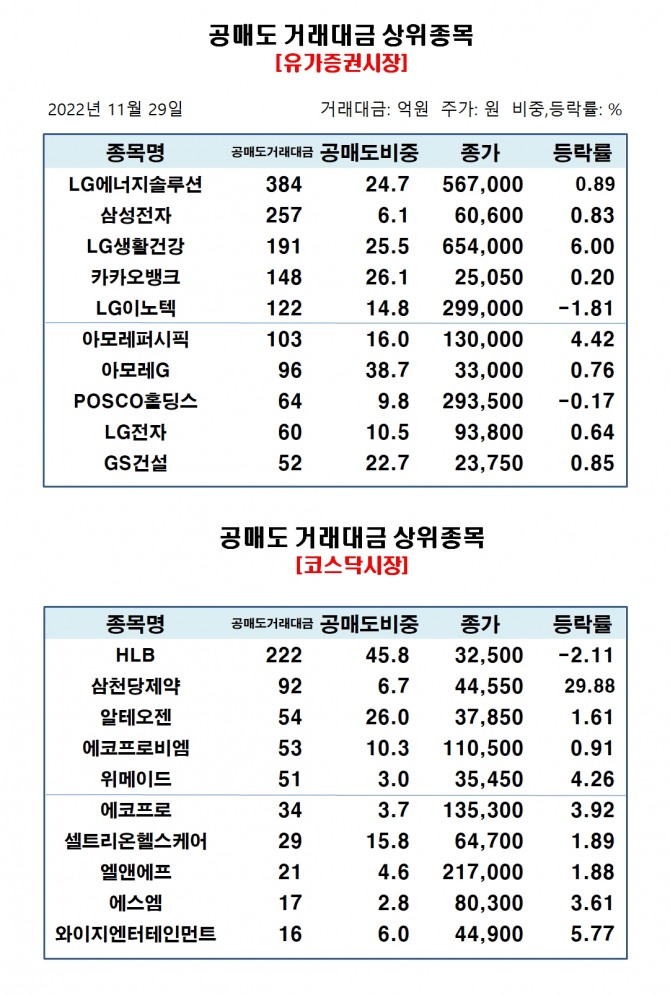 유가증권시장에서 공매도 거래대금 상위종목은 LG에너지솔루션 384억원, 삼성전자 257억원, LG생활건강 191억원, 카카오뱅크 148억원, LG이노텍 122억원, 아모레퍼시픽 103억원, 아모레G 96억원, POSCO홀딩스 64억원, LG전자 60억원, GS건설 52억원 순으로 집계됐다.