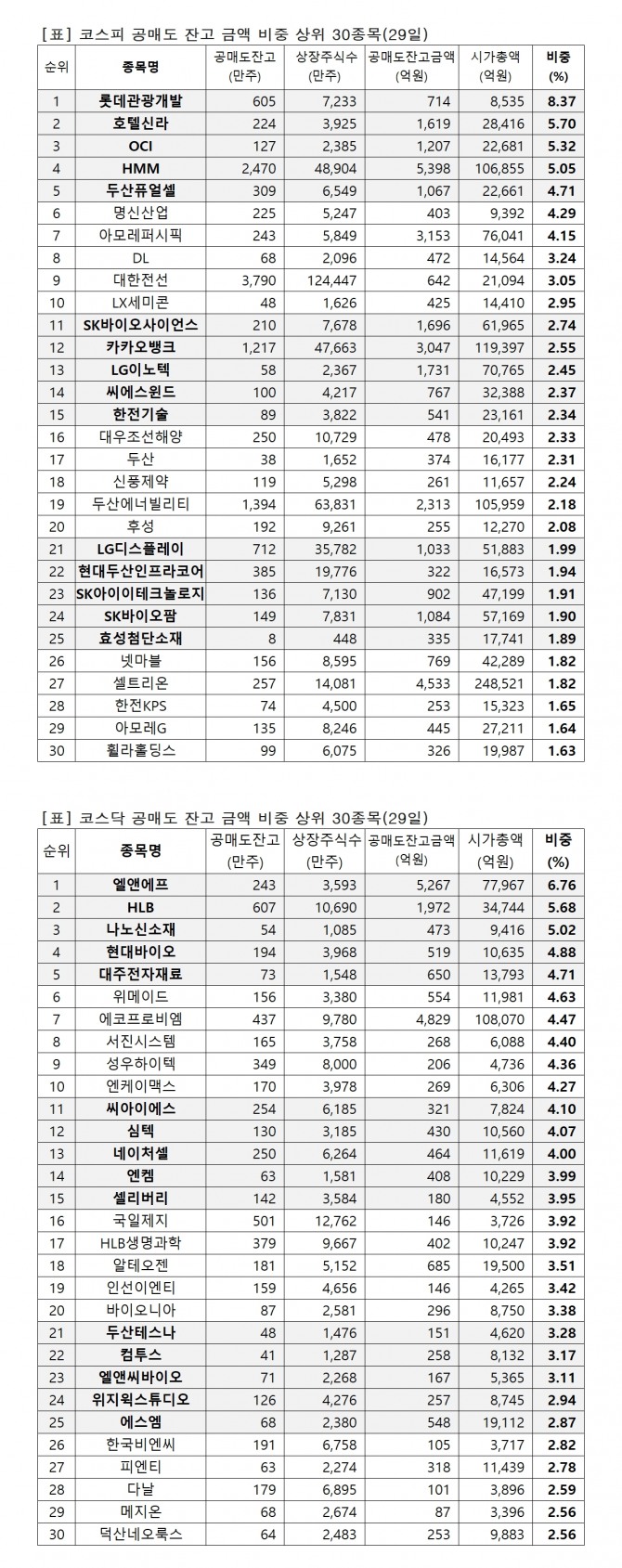 2일 한국거래소에 따르면 지난달 29일 기준 유가증권시장과 코스닥시장에서 시가총액 대비 공매도 잔고금액 비중 상위 종목은 다음과 같다.