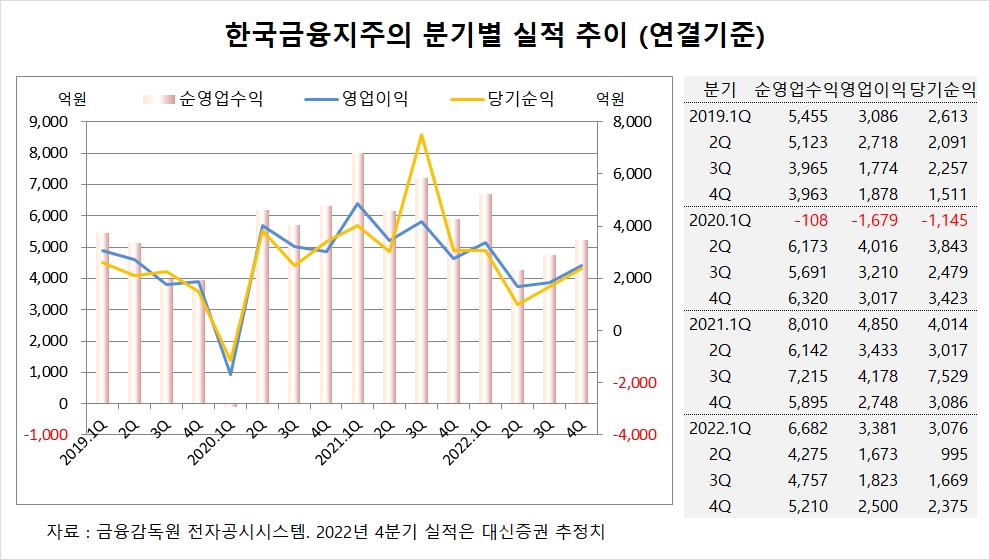 대신증권은 한국금융지주의 올해 4분기 연결기준 순영업수익이 5210억원, 영업이익이 2500억원, 당기순이익이 2375억원에 이를 것으로 내다보고 있습니다.