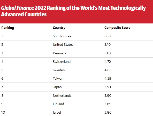 미국과 한국에 이은 기술대국으로는 덴마크(3위), 스위스(4위), 스웨덴(5위), 대만(6위), 일본(7위), 네덜란드(8위), 핀란드(9위), 이스라엘(10위) 순으로 집계돼 대만, 일본, 이스라엘을 제외하면 유럽 국가들이 높은 순위를 거의 대부분 차지한 것으로 나타났다.