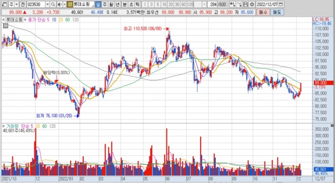 롯데쇼핑의 지난 1년여간 주가 변동 추이. 키움증권 HTS 캡처이미지 확대보기