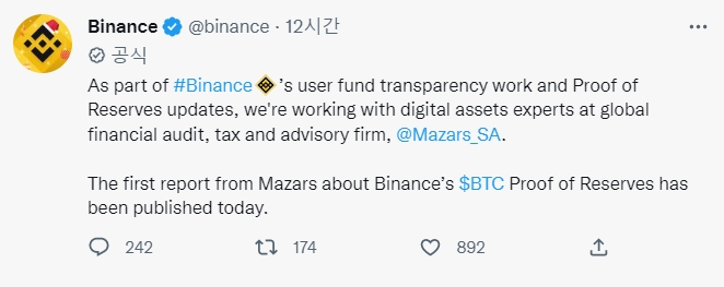 글로벌 회계법인 마자스(Mazars)가 가상화폐 거래소 바이낸스의 비트코인 보유고가 과다 담보되었다고 7일 보고했다. 출처=바이낸스 공식 트위터