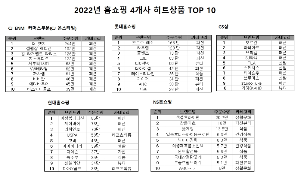 현대홈쇼핑과 GS샵 역시 히트 상품 톱10 중 6개가 패션 브랜드였다. 현대홈쇼핑은 이상봉에디션, 제이바이, 라씨엔토 등의 순으로 GS샵은 모르간, 라삐아프, 브리엘 등의 순으로 잘 팔렸다. GS샵은 패션의류 전체 매출이 전년대비 20% 신장했다.