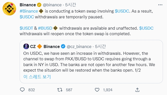 바이낸스는 '토큰 스왑'을 하는 동안 USDC 인출을 "일시적으로 중단"했다고 밝혔다. 이것은 법정 통화 없이 하나의 암호화폐를 다른 암호화폐로 교환하는 것을 포함한다.