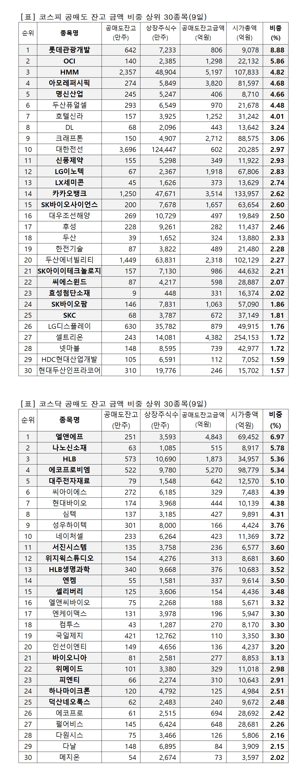 이미지 확대보기14일 한국거래소에 따르면 지난 9일 기준 유가증권시장과 코스닥시장에서 시가총액 대비 공매도 잔고금액 비중 상위 종목은 다음과 같다.