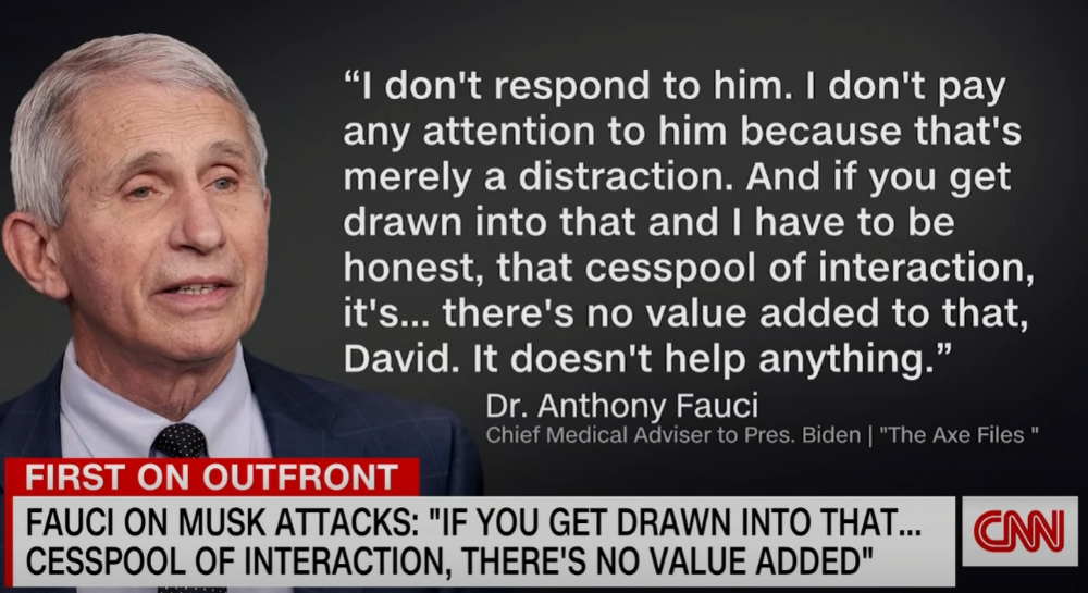 파우치는 데이비드 액셀로드 CNN 해설위원이 13일 진행한 팟캐스트 방송에 출연한 자리에서 머스크의 주장에 대한 입장을 질문받고 “그런 사람의 주장에는 대응하지 않는다는 게 내 입장”이라면서 “그런 주장에 대응하는 것 자체가 정신만 어지럽게 하는 일이라 전혀 개의치 않는다”고 밝혔다.