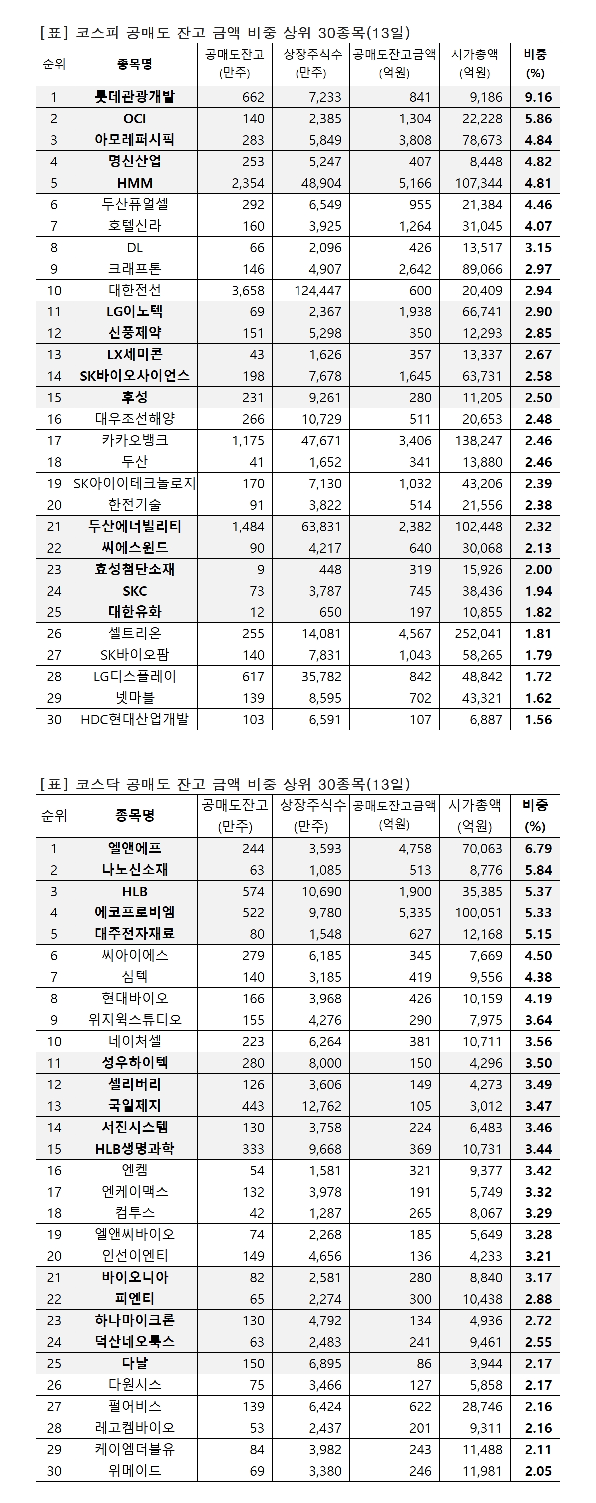 이미지 확대보기유가증권시장 시가총액 대비 공매도 잔고금액 비중(13일)