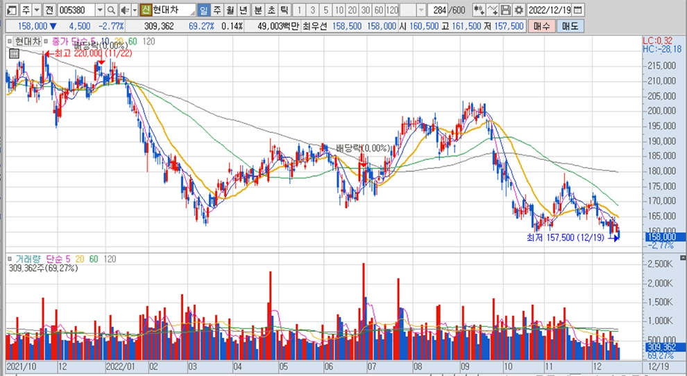 이미지 확대보기현대차의 주가는 19일 오전 10시 10분 현재 전 거래일보다 4500원(2.77%) 내린 15만8000원에 거래되고 있습니다. 장중에는 52주 최저가 15만7500원을 기록했습니다.