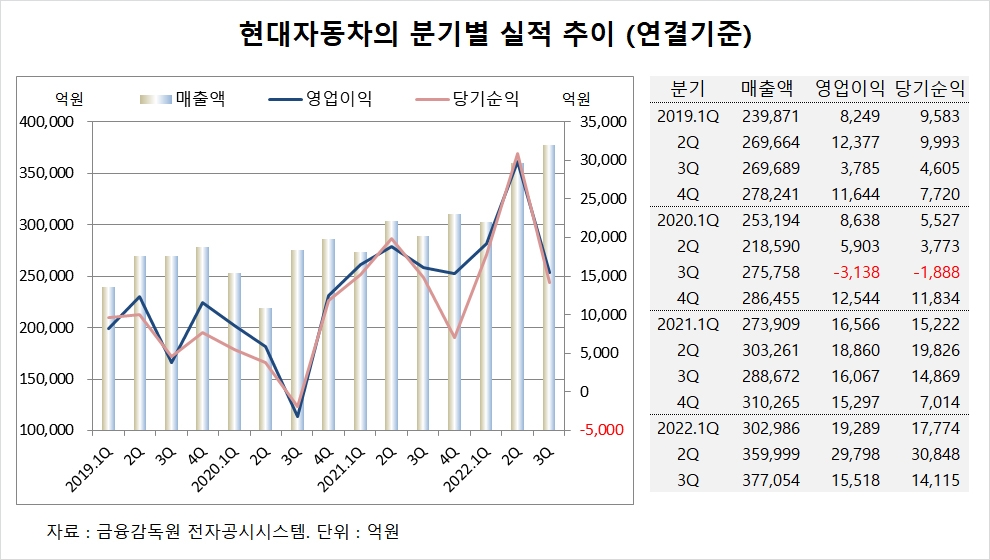 이미지 확대보기현대차는 올해 3분기 연결기준 매출액이 37조7054억원, 영업이익이 1조5518억원, 당기순이익이 1조4115억원을 기록했다고 공시했습니다.